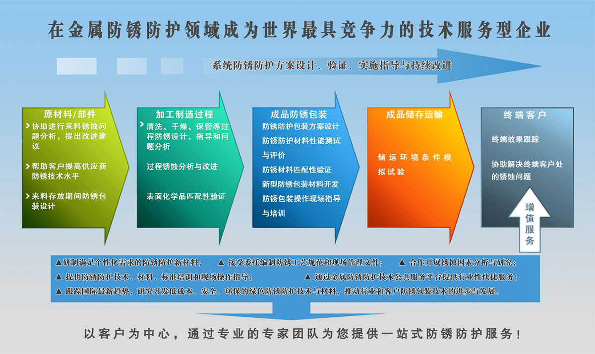 通過(guò)一站式、標(biāo)準(zhǔn)化、差異化、增值化的服務(wù)來(lái)降低客戶的心理成本和使用成本,最終提高客戶的收益,使沈陽(yáng)防銹服務(wù)“超越客戶期望,超越行業(yè)標(biāo)準(zhǔn)”,成為防銹業(yè)服務(wù)的旗艦品牌。
