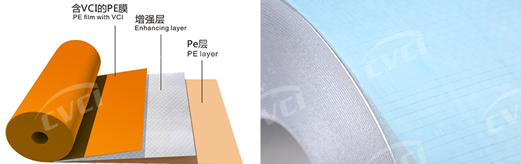 織物增強型氣相防銹膜是我公司專利產(chǎn)品,該產(chǎn)品在國內(nèi)外冶金領域應用廣泛。由氣相防銹膜與聚乙烯或聚丙烯材質復合而成,采用兩層或三層復合結構。