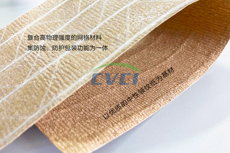 加網(wǎng)復(fù)合紙以?xún)?yōu)質(zhì)的中性皺紋紙為基材,按結(jié)構(gòu)和特性分為皺紋加網(wǎng)復(fù)合紙和阻隔型皺紋加網(wǎng)復(fù)合紙。產(chǎn)品可添加氣相緩蝕劑,制作成加網(wǎng)型復(fù)合氣相防銹紙。